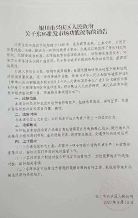 新聞中心3月(yue)13日,興慶區人民(min)政府正式發(fa)(fa)布(bu)(bu)了《銀川(chuan)市(shi)興慶區人民(min)政府關于東(dong)(dong)環(huan)(huan)批發(fa)(fa)市(shi)場功(gong)能疏解(jie)的(de)通告》。通告肯定東(dong)(dong)環(huan)(huan)市(shi)場的(de)歷(li)史(shi)功(gong)用(yong),同時指出(chu)現階段(duan),東(dong)(dong)環(huan)(huan)市(shi)場已經不能滿足城市(shi)規(gui)劃布(bu)(bu)局(ju)及功(gong)能定位的(de)發(fa)(fa)展需要,并就東(dong)(dong)環(huan)(huan)市(shi)場的(de)的(de)功(gong)能疏解(jie)事宜給出(chu)了具體指導及工作要求,東(dong)(dong)環(huan)(huan)動遷已成定局(ju)。