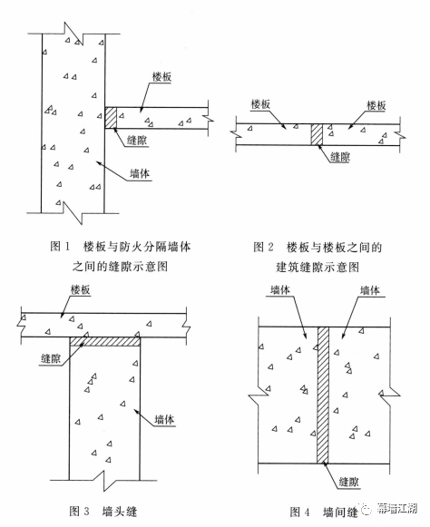 4.0.2 建筑(zhu)(zhu)縫隙(xi)按所在(zai)的建筑(zhu)(zhu)部位分為(wei)4類:樓板(ban)與防火分隔(ge)墻體側面之間(jian)的建筑(zhu)(zhu)縫隙(xi),如圖1所示(shi)(shi);樓板(ban)與樓板(ban)之間(jian)的建筑(zhu)(zhu)縫隙(xi),如圖2所示(shi)(shi);防火分隔(ge)墻體頂端與樓板(ban)下側之間(jian)的建筑(zhu)(zhu)縫隙(xi)(墻頭縫),如圖3所示(shi)(shi);防火分隔(ge)墻體之間(jian)的建筑(zhu)(zhu)縫隙(xi)(墻間(jian)縫),如圖4所示(shi)(shi)。