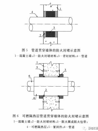 本(ben)節根(gen)據管(guan)(guan)道(dao)(dao)材(cai)料(liao)的(de)熔(rong)點和燃燒(shao)性能,將管(guan)(guan)道(dao)(dao)分為三類:鋼、鑄鐵(tie)、銅、銅合金(jin)(jin)、鎳合金(jin)(jin)等金(jin)(jin)屬(shu)(shu)管(guan)(guan)道(dao)(dao)以(yi)及陶(tao)瓷、石英玻(bo)璃(li)等不燃材(cai)料(liao)管(guan)(guan)道(dao)(dao);鋁或鋁合金(jin)(jin)等金(jin)(jin)屬(shu)(shu)管(guan)(guan)道(dao)(dao)以(yi)及玻(bo)璃(li)纖維增強(qiang)管(guan)(guan);塑(su)料(liao)管(guan)(guan)等。金(jin)(jin)屬(shu)(shu)管(guan)(guan)道(dao)(dao)以(yi)熔(rong)點1000℃劃(hua)分,主(zhu)要考慮了標準溫升曲線和試驗爐(lu)的(de)條件(jian)等因素,當構件(jian)達到(dao)1.50h~2.00h的(de)耐火(huo)時(shi)間時(shi),爐(lu)內溫度達到(dao)1000℃。管(guan)(guan)道(dao)(dao)貫(guan)穿墻體或樓板(ban)的(de)防火(huo)封(feng)堵示意,見圖5~圖7。