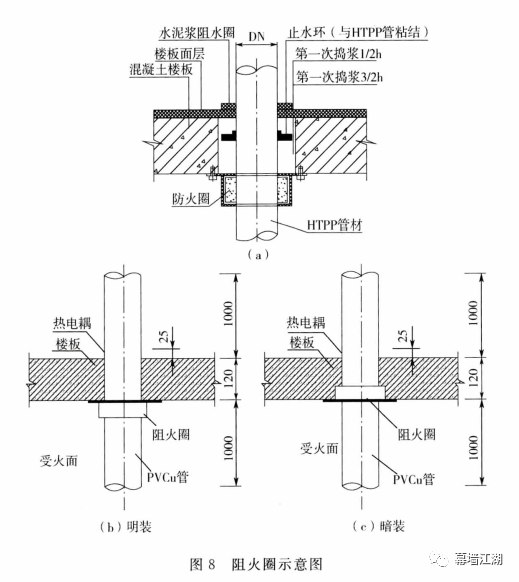 3.0.11 阻(zu)(zu)(zu)火(huo)(huo)(huo)(huo)(huo)圈(quan)或(huo)阻(zu)(zu)(zu)火(huo)(huo)(huo)(huo)(huo)包(bao)帶(dai)(dai)安(an)裝(zhuang)(zhuang)時,是將阻(zu)(zu)(zu)火(huo)(huo)(huo)(huo)(huo)圈(quan)或(huo)阻(zu)(zu)(zu)火(huo)(huo)(huo)(huo)(huo)包(bao)帶(dai)(dai)套在或(huo)纏(chan)繞在硬聚氯乙烯等塑料管道外壁(bi)上。火(huo)(huo)(huo)(huo)(huo)災(zai)時,阻(zu)(zu)(zu)火(huo)(huo)(huo)(huo)(huo)圈(quan)或(huo)阻(zu)(zu)(zu)火(huo)(huo)(huo)(huo)(huo)包(bao)帶(dai)(dai)的(de)(de)(de)阻(zu)(zu)(zu)燃膨脹芯材(cai)受熱迅速膨脹后(hou)擠壓管道,使貫穿孔口(kou)被封堵(du)(du),起到阻(zu)(zu)(zu)止火(huo)(huo)(huo)(huo)(huo)勢和煙(yan)氣沿燒蝕(shi)的(de)(de)(de)管道蔓延的(de)(de)(de)作(zuo)用。阻(zu)(zu)(zu)火(huo)(huo)(huo)(huo)(huo)圈(quan)或(huo)阻(zu)(zu)(zu)火(huo)(huo)(huo)(huo)(huo)包(bao)帶(dai)(dai)有明裝(zhuang)(zhuang)和暗裝(zhuang)(zhuang)兩種安(an)裝(zhuang)(zhuang)方(fang)式,但水平貫穿墻體等的(de)(de)(de)孔口(kou)的(de)(de)(de)封堵(du)(du)應(ying)在墻的(de)(de)(de)兩側(ce)都(dou)設(she)置阻(zu)(zu)(zu)火(huo)(huo)(huo)(huo)(huo)圈(quan)或(huo)阻(zu)(zu)(zu)火(huo)(huo)(huo)(huo)(huo)包(bao)帶(dai)(dai),豎向(xiang)貫穿樓板等的(de)(de)(de)孔口(kou)的(de)(de)(de)封堵(du)(du),則宜在樓板下側(ce)設(she)置阻(zu)(zu)(zu)火(huo)(huo)(huo)(huo)(huo)圈(quan)或(huo)阻(zu)(zu)(zu)火(huo)(huo)(huo)(huo)(huo)包(bao)帶(dai)(dai)。
