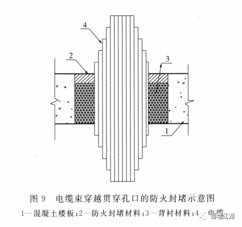 本節貫(guan)穿(chuan)物的類(lei)型包括電(dian)氣線路導管、單根(gen)或多根(gen)電(dian)纜(lan)、母線槽、電(dian)纜(lan)槽盒。電(dian)纜(lan)束穿(chuan)越貫(guan)穿(chuan)孔口的防火封(feng)堵示意見圖9。