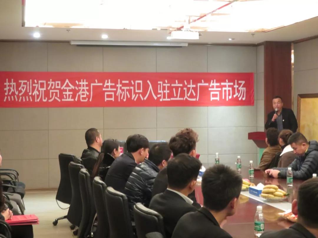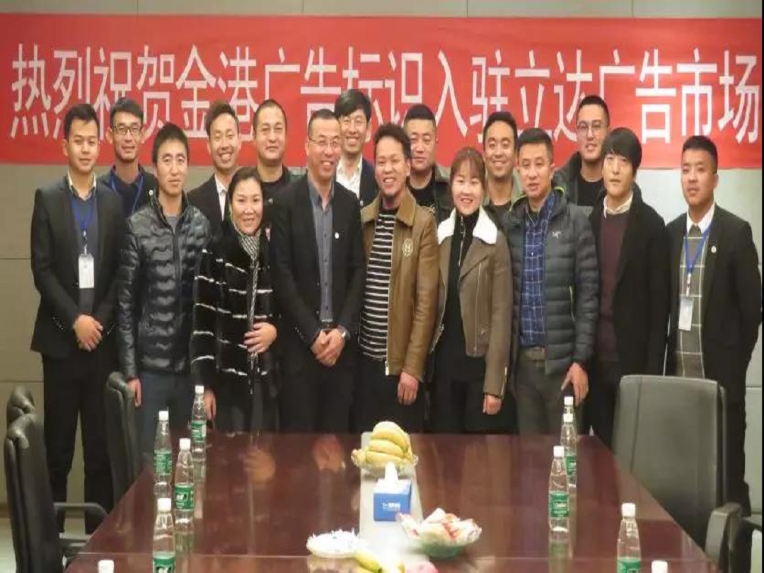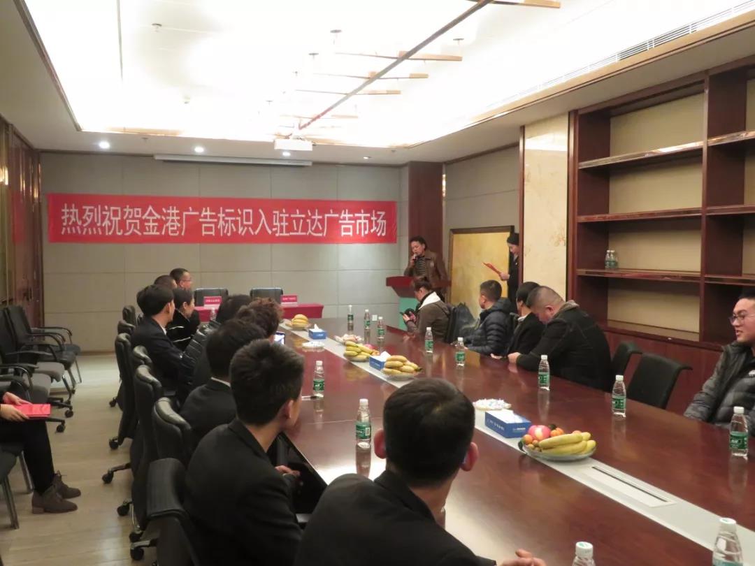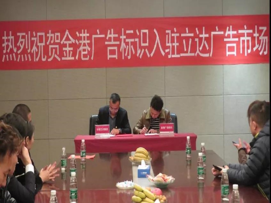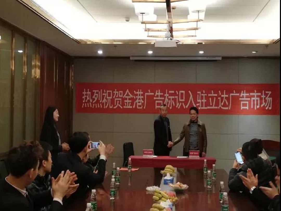 新聞中心2019年1月15日,寧(ning)夏廣(guang)告加(jia)工(gong)龍頭企業(ye)金(jin)港廣(guang)告入駐(zhu)立(li)達(da)廣(guang)告市場簽(qian)約儀(yi)式(shi)在立(li)達(da)營(ying)銷中(zhong)心會議室舉行。華(hua)尊立(li)達(da)集團營(ying)銷運營(ying)總(zong)監馬龍、華(hua)尊立(li)達(da)集團營(ying)銷經理張志飛、金(jin)港廣(guang)告標識(shi)總(zong)經理周圣飚、中(zhong)港廣(guang)告材料(liao)超市業(ye)務總(zong)經理羅(luo)剛(gang)剛(gang)、紫光工(gong)程有限公(gong)(gong)司(si)總(zong)經理李(li)海(hai)林、雄力(li)(li)達(da)廣(guang)告標識(shi)有限公(gong)(gong)司(si)總(zong)經理禹世雄、銀(yin)川藍天創想廣(guang)告設備有限公(gong)(gong)司(si)總(zong)經理董兵、華(hua)岳(yue)金(jin)匠(jiang)總(zong)經理李(li)小岳(yue)、凝聚力(li)(li)廣(guang)告總(zong)經理殷中(zhong)海(hai)、和泰標識(shi)總(zong)經理邊北方及(ji)立(li)達(da)營(ying)銷中(zhong)心的相關(guan)部(bu)門負(fu)責人一同參加(jia)了(le)本次簽(qian)約儀(yi)式(shi),簽(qian)約儀(yi)式(shi)由立(li)達(da)集團策劃部(bu)經理吳文博主(zhu)持。